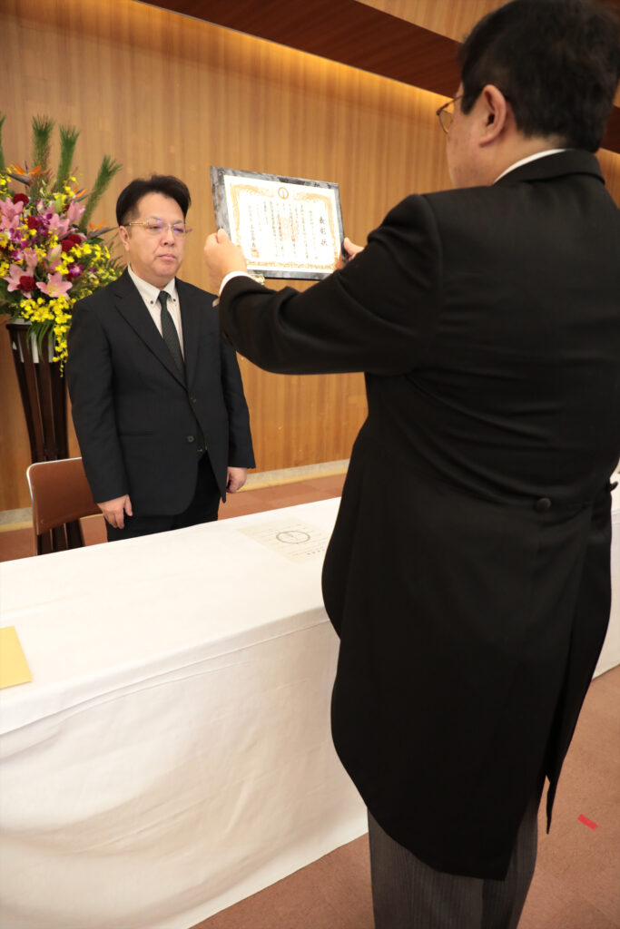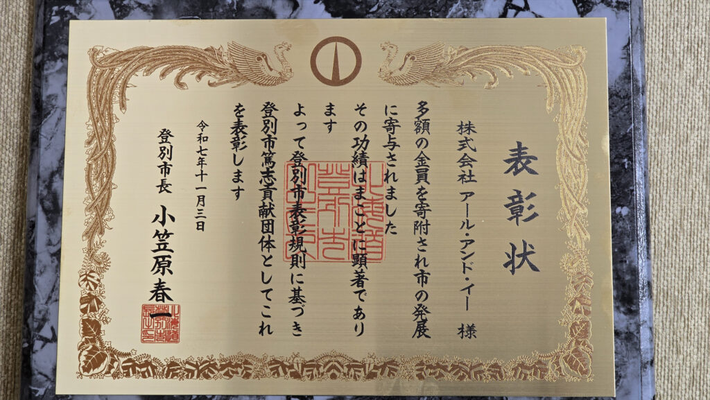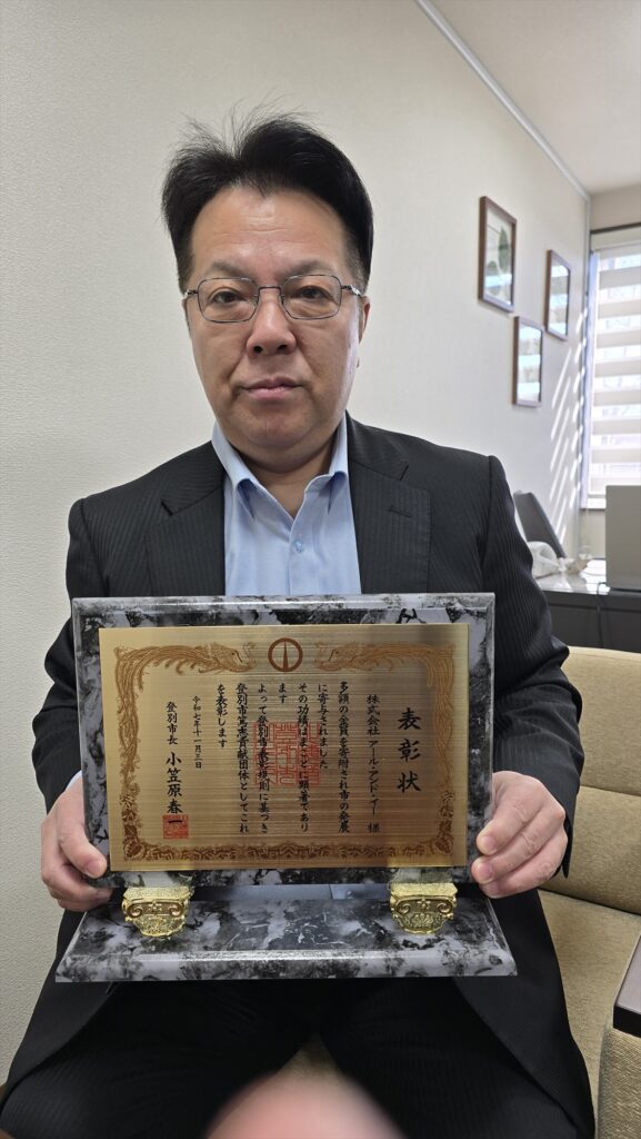 「2025年度登別市功労者表彰・登別市表彰」は,長年,登別市に貢献した個人や,団体を表彰するもので,今回多額の金員を寄付され市の発展に寄与された「篤志貢献表彰」として弊社が表彰され,伊藤代表取締役が登別市長より表彰楯を受け取りました。