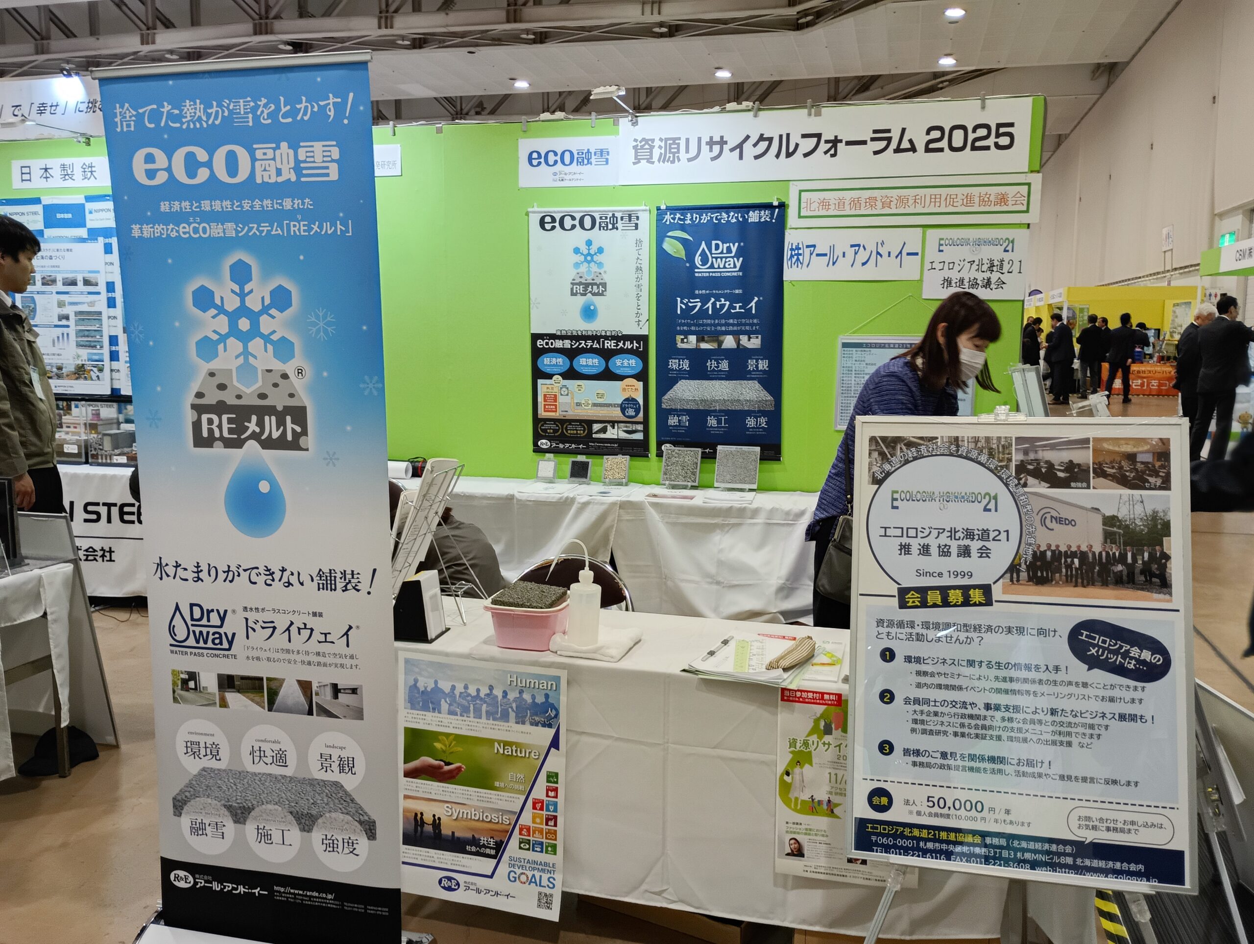 出展ブースでは、エコ融雪システム「REメルト」、透水性環境舗装材「ドライウェイ」等のポスターや、パンフ・チラシを展示し、90名以上の来場者にお越しいただきました。