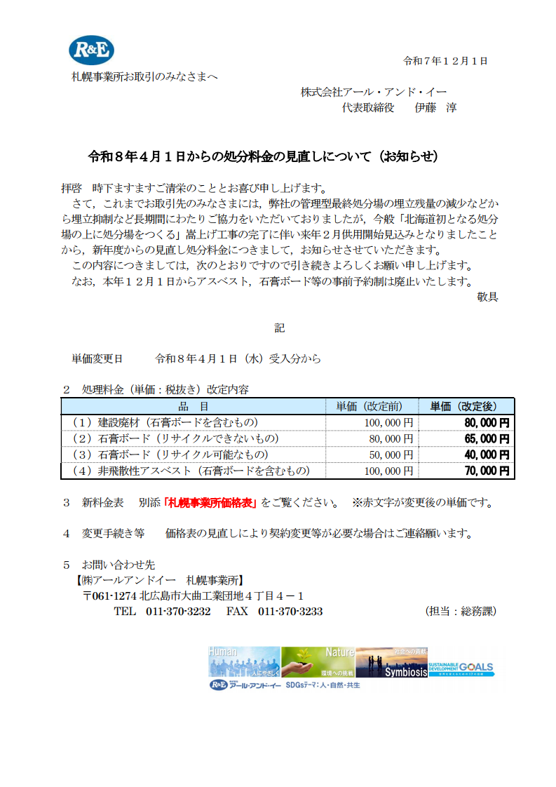 さて,これまでお取引先のみなさまには,弊社の管理型最終処分場の埋立残量の減少などから埋立抑制など長期間にわたりご協力をいただいておりましたが,今般「北海道初となる処分場の上に処分場をつくる」嵩上げ工事の完了に伴い来年2月供用開始見込みとなりましたことから,新年度からの見直し処分料金につきまして,お知らせさせていただきます。